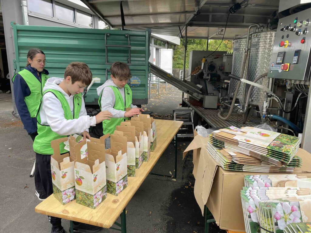 Auch in diesem Herbst ernteten wieder über 100 Schülerinnen und Schüler unter der Aufsicht von Markus Schmidt die Äpfel auf der Streuobstwiese und konnten mit 1220 Liter Apfelsaft wieder eine sehr gute Ernte einfahren. Der Apfelsaft wurde gepresst und in Kartons à 3-Liter, 5-Liter- und 10-Liter abgefüllt werden.